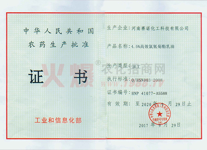 賽諾公司于2011年3月在國家農(nóng)業(yè)部進行了豐之盼產(chǎn)品的登記申報,并于2014年4月25日獲得了國家的正式農(nóng)藥登記,登記號為PD20141062。這是國內(nèi)第二家取得制劑正式登記的廠家。也是第二家把誘抗素商品化生產(chǎn)的廠家。