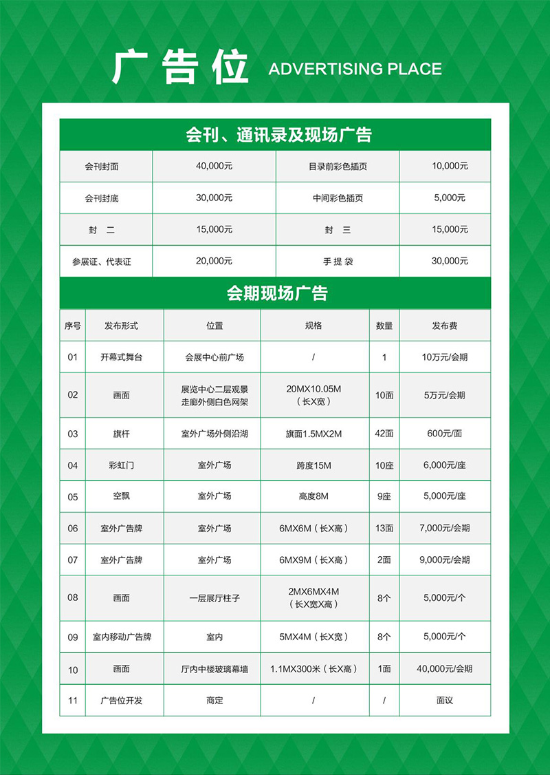 3.室外特裝展位費:500元/㎡(原則上整體銷售)。